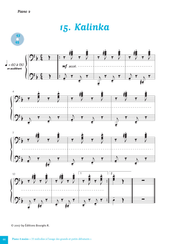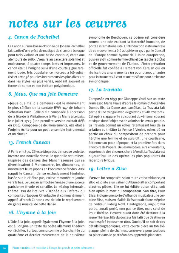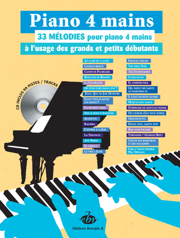 Descriptif : Comme tout professeur de piano, je suis continuellement en quête d’idées pour motiver les jeunes et moins jeunes élèves à la découverte de l’instrument. Le répertoire pour Piano Quatre Mains accessible aux débutants est assez restreint. L’écriture pianistique en ce genre doit prendre en compte une faible technique pianistique et des notions de solfège en cours d’apprentissage, sans que tout cela ne nuise au rendu musical. C’est pourquoi j’ai eu l’idée de créer ce recueil « grands débutants », attentif à ces difficultés, recueil où tout jeune pianiste peut aborder dès son premier cours, avec son professeur ou un autre élève, une pièce à Quatre Mains. L’expérience, appliquée en premier lieu avec mes élèves, est réellement enrichissante : elle révèle l’importance du rythme, renforce la musicalité, la motivation, et surtout, amène le partage de la musique et l’écoute de l’autre. Comme anecdote…j’ai donné à un élève de six ans, qui en était à son deuxième cours, l’étude d’une des premières pièces de ce recueil. Rapidement acquise, je lui ai dit que nous allions la jouer ensemble à quatre mains. Après quelques mesures, étonné du rendu sonore il m’a souri, car à ce moment là il était déjà Pianiste. Musicalement David Neyrolles