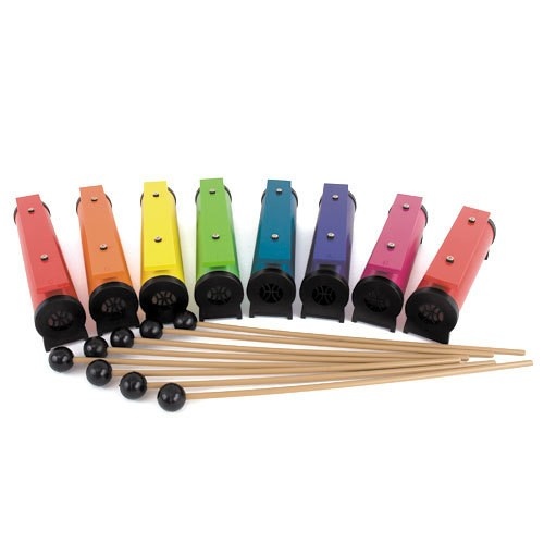 Descriptif : Le classic' métallonotes contient 8 lames montées sur des tubes en plastique style boomwhackers et 8 mailloches qui permettent de faire jouer 8 personnes. '' '' Il y figure un système de lettrage sur les lames qui correspond à la notation anglo-saxone avec le La (A) comme note de référence, universel pour l'accordage des instruments. Chaque lame correspond à une couleur pour un repérage facile des notes, ce qui rend cet instrument très attractif. à poser sur un support ou à prendre en main, les notes ont une excellente résonance comparable à celle d'un métallophone. '' '' Les 8 notes sont livrées dans une housse de transport pour en faciliter le rangement. '' '' 8 lames (1 octave)