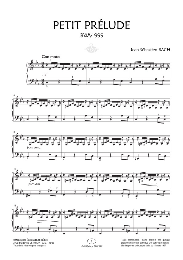 A l’origine, le prélude en ut mineur « BWV 999 » fut écrit pour luth. Son manuscrit est préservé à la Staatsbibliothek de Berlin. Cette œuvre est essentiellement jouée par des guitaristes qui ont préféré arranger des pièces pour luth de Jean Sebastien Bach plutôt que d’autres œuvres du même compositeur. Il est possible qu'une première lecture ne mette pas immédiatement en évidence la sérénité que réclame ce petit prélude, mais l'imagination de l'interprète, débarrassée d'éléments parfois trop subjectifs, lui permettra de comprendre la finalité musicale et instrumentale de tel ou tel doigté et d'avoir accès à la musique du grand J.S. Bach avec un piano.