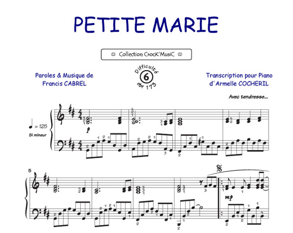Descriptif : Cette partition est issue de la collection CrocK'MusiC constituée de transcriptions de chansons françaises pour le Piano, acompagnées de leurs paroles.