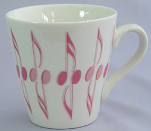 Descriptif : Tasse de porcelaine blanche décorée de notes de musique. <'