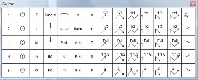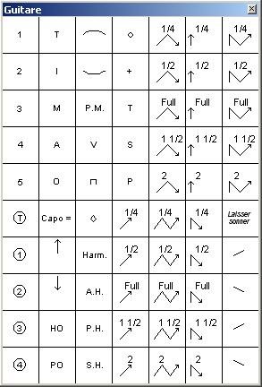 Un ensemble de symboles propres à la guitare peuvent influencer le rendu sonore de la partition.