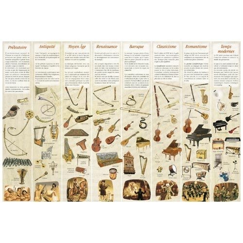 Descriptif : Du sifflet en os à la flûte traversière, de l'arc musical au violon, du lithophone au vibraphone, les instruments de musique ont suivi une longue évolution depuis les temps préhistoriques jusqu'à l'époque contemporaine.''' ''' Vous suivrez avec intérêt cette étonnante frise chronologique qui nous enseigne les transformations siècle après siècle d'un monde instrumental sans cesse renouvelé. Une réalisation instructive et d'une grande utilité pédagogique !
