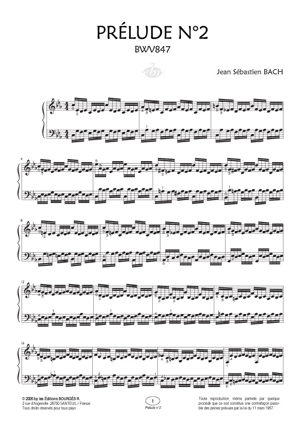 Le 2e Prélude du premier livre du Clavier bien tempéré figure, dans sa version originale dans le Klavierbüchlein composé pour Wilhelm Friedemann. Dans cette pièce de caractère didactique, étude dans le style de la toccata, les deux mains égrènent, en sens contraire, les doubles croches en un mouvement perpétuel. La course rapide devient effrénée (presto, mes. 28-33), puis s’arrête net. Deux accords de tonique arpégés, sur lesquels se déploie le discours, à la main droite, dans le style du récitatif (adagio, mes. 34). Enfin, reprise du tempo initial pour les quatre mesures conclusives (allegro, mes. 35), le Prélude s’achevant sur la tierce picarde (en ut majeur).