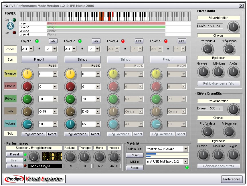 2/ Mode “Performance” : En connectant à votre ordinateur un instrument équipé d'une prise MIDI (tel qu'un clavier maître, arrangeur, piano numérique, guitare ou contrôleurs MIDI divers...) PRODIPE VE, sans rajouter de logiciel, devient un véritable instrument de musique, capable de restituer l'intégralité des éléments d’un orchestre en temps réel et sans latence. Les fonctions autonomes de PRODIPE VE vous permettent de personnaliser et de créer vos propres ‘Performances’ (registrations) que vous pourrez rappeler à tout moment.