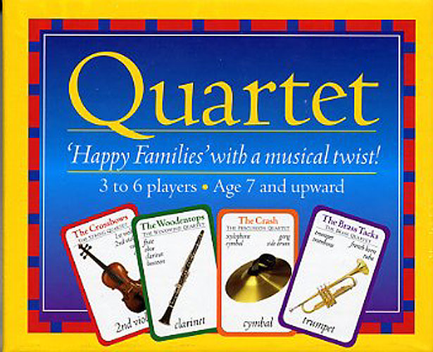 Descriptif : Le jeu des 7 familles avec une tournure musicale! Faites autant de groupes de 4 instruments que possible pour gagner le jeu! A jouer chez soi ou en famille. Un excellente façon d 'améliorer sa reconnaissance d'instruments en utilisant les quartets speciaux du jeu tels que les Standing stones (groupe de rock) Les Woodentops (quartet d'instruments à vent), les Blue Notes (Quartet de jazz) et les Rupees (groupe indien). A jouer chez soi ou en classe. A partir de 2 joueurs, à partir de 4 ans. Contient 36 cartes à jouer.