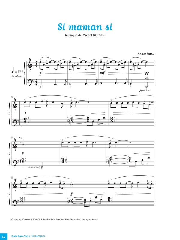 Descriptif : Cet ouvrage est le fruit de dix ans d’enseignement pianistique. '' '' J’ai souvent vu arrivé comme d’autres professeurs de jeunes élèves démotivés, ayant perdu tout intérêt à la pratique de la Musique après seulement une ou deux années d’apprentissage. '' '' A l’écoute de leurs désirs, j’ai commencé à écrire des transcriptions d’œuvres proches d’eux, que ce soit par l’actualité musicale, scolaire ou tout simplement par leur propre sensibilité à tel ou tel artiste. '' '' Chaque arrangement devait prendre en compte leur capacité technique afin de donner à ces pianistes une sensation de facilité. Leurs lacunes en lecture s’effaçaient en sollicitant le travail de l’oreille sur ces chansons connues de tous. '' '' Quelques mois suffisaient à ces pianistes pour retrouver un sens à leurs efforts, et s’intéresser à nouveau à des répertoires aussi traditionnels qu’indispensables. '' '' Ainsi est née la collection CrocK’MusiC qui permet aujourd’hui à tous l’étude de ces transcriptions. '' '' Patrice Bourgès