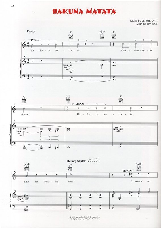 Descriptif : Partitions pour piano, voix et guitare de la bande originale du film `Le Roi Lion`.' Musique par Elton John, paroles par Tim Rice.' Couverture du livre en 3D, édition Deluxe.' Vendu sous cellophane.
