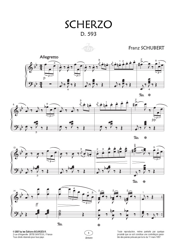 L'opus 593 se compose de deux scherzi. Le premier est en si bémol majeur et le deuxième en ré bémol majeur. Ces deux scherzi sont destinés à l'origine aux sonates D567 et D568. Le scherzo en si bémol est une sorte d'invitation à la danse par son allure rythmique enlevé et sautillant. Cette pièce respire le bien-être et la frivolité sur un ton aimable et gracieux. La bienséance de Schubert s'exprime dans cette page, ainsi que sa simplicité à l'état pur. Venez délecter ce scherzo en famille !