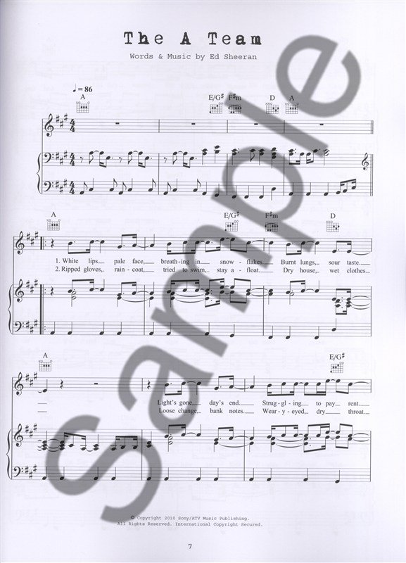 Descriptif : Après le recueil pour Guitare Tablatures, voici celui pour piano, chant et guitare (positions d'accords) du premier album de Ed Sheeran nommé meilleur jeune talent lors du UK Festival Awards. Inclus son Hit `The A Team`