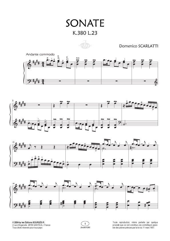 Cette Sonate, célèbre à juste titre, est de coupe binaire avec deux sections avec reprises. Première section en mi majeur s’achevant dans le ton de la dominante, si majeur. Seconde section s’ouvrant sur le matériau thématique repris de la première, variant et développant celui-ci, modulant à l’extrême, pour finir dans la tonalité initiale de mi majeur et pour conclure à l’identique de la première partie. L'atmosphère de cette Sonate est particulière et on y a entendu et même vu une mise en scène de toute une procession. Trois noires sonnant comme les coups d’un bâton de chef d’orchestre et rythmant pompeusement cette petite cérémonie, des quintes vides, des notes répétées, le dactyle omniprésent, tout cela semblant échappés d’une banda royale.
