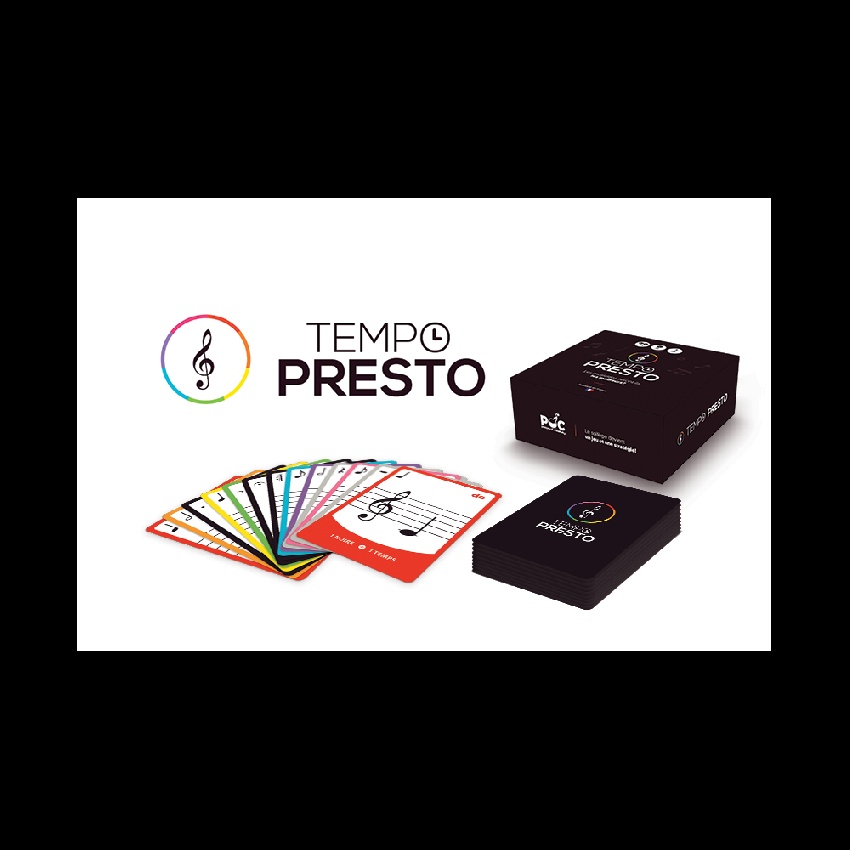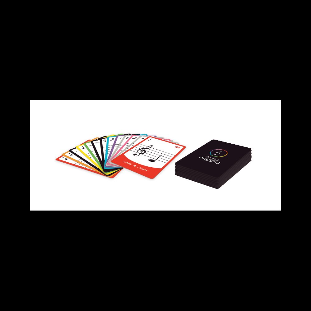Descriptif : A partir de 8 ans.' ' Quoi de mieux qu’un jeu de cartes pour se familiariser avec les signes du solfège ?' ' Apporter une nouvelle dimension à votre approche de la musique avec un jeu rapide et divertissant : c’est là, la force de “Tempo Presto.”' ' Pratiques et familiaux, les jeux de cartes sont parmi les jeux de société les plus utilisés au sein d’un groupe. L’envie de vous proposer un jeu de cartes amusant et éducatif : une évidence.' ' Le jeu est constitué des cartes notes : des cartes colorées portant le nom des notes de la gamme de DO avec des durées différentes.' ' Les cartes «silence» : elles sont primordiales. Elles seront utiles pour effectuer des coups bas et faire piocher ces adversaires.' ' Les cartes `spéciales` : représentent des symboles de la musique détournés pour le jeu.' ' PRINCIPE : Une musique se découpe en temps ; dans «Tempo Presto», ils sont représentés par chacun des joueurs autour de la table. Le vainqueur est celui qui n’a plus de carte.