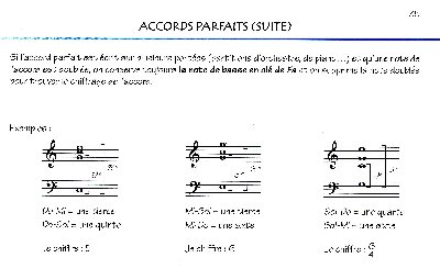 Contenu : Les tonalités majeures Tableau des tonalités majeures Comment trouvez une armure à partir du nom de la tonalité Test d'évaluation n°1 Les tonalités mineures Comment distinguer si la tonalité est majeure ou mineure dans un morceau Tableau des tonalités majeures et mineures Test d'évaluation n°2 Les tons voisins - Les notes modales et tonales Test d'évaluation n°3 La qualification des intervalles Procédé rapide pour trouver la qualification d'un intervalle Tableau de la composition des intervalles Test d'évaluation n°4 Le renversement d'un intervalle Le redoublement d'un intervalle Test d'évaluation n°5 Les accords parfaits et leur chiffrage Test d'évaluation n°6a, n°6b Les cadences (parfaite, imparfaite, demi-cadence) - La tierce picarde Test d'évaluation n°7a, n°7b, n°7c L'accord de septième de dominante Test d'évaluation n°8 Les trois formes de gamme mineure Test d'évaluation n°9 Les notes étrangères à l'harmonie : broderie, note de passage, approggiature Les instruments transpositeurs Test d'évaluation n°10 Principales formations instrumentales Les formes musicales : le rondeau, le concerto, la symphonie, le lied Commentaire d'écoute Commentaire d'écoute - Application Oeuvres ou extraits d'oeuvres écoutés