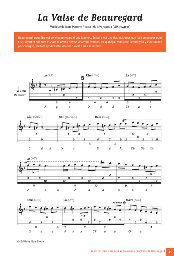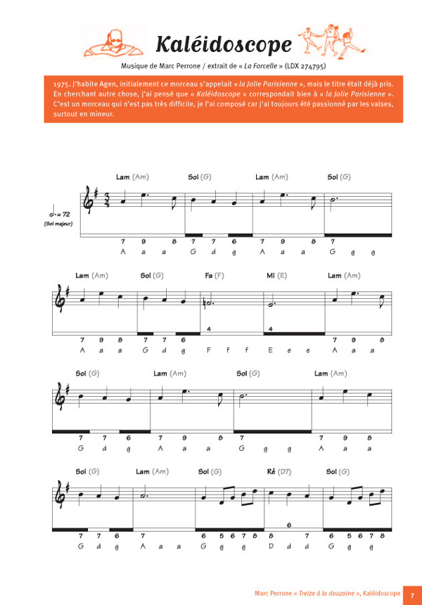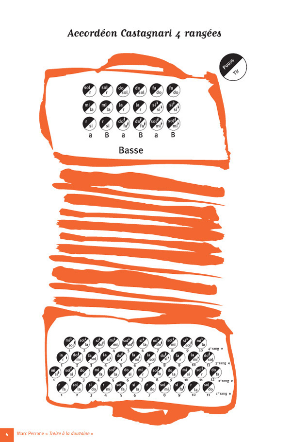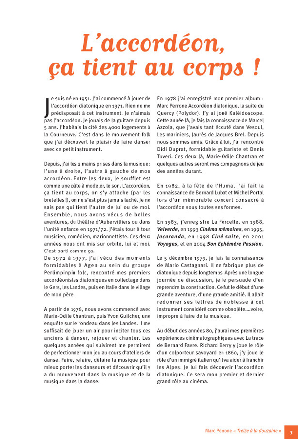 Descriptif : Quelques éclaircissementssur cet ouvrage.' ' Nous jouons de l’accordéon diatonique ; c’est un instrument qui n’est pas fini, c'est-à-dire qu’il existe beaucoup de systèmes différents les uns des autres et on continue à en inventer. Pour moi il n’y a pas de système qui prévaut, donc moi je joue sur mon système qui est décrit dans ce livre. C’est un système pas plus mal que les autres.' ' Pour le recueil on a doigté certains morceaux avec mon système car je les ai composées sur ces instruments là, donc pour en rendre bien compte, le mieux était de les doigter dans ce système, comme par exemple « La valse Dombelle », « La valse de Beauregard », une des versions des « Valcerves », et puis les autres sont doigtées pour deux rangées 8 basses ou pour trois rangées système Jean-pierre Leray c'est-à-dire deux rangées sol-do et, plus une rangée d’altérations.' ' C’est une chose importante mais de toute façon, les instruments dont nous jouons sont des instruments lacunaires, c'est-à-dire qu’il manque des choses pour avoir le confort moderne, la possibilité de transposition, de pouvoir faire toutes les harmonies etc. Je suis arrivé à un système qui me satisfait pour l’instant, je pense que vu mon âge avancé (…) je n’en inventerai pas d’autres parce que ça commence à me satisfaire assez.' ' C’est le 4 rangées où j’ai toutes les notes de la gamme chromatiques dans les 2 sens à la main droite ce qui fait que je peux superposer avec la main gauche toutes les notes de la gamme chromatique, ce que je ne pouvais pas faire jusqu’à maintenant, jusqu’à ce que j’aie cet instrument en 1995. Je pense que c’était important de clarifier ce détail, que les tablatures c’est très bien, moi ça n’est pas du tout mon truc, la notation musicale non plus. Je lis, je déchiffre à l’amiable, comme disait un de mes camarades et je me débrouille avec les notes du mieux que je peux mais en règle générale je travaille à l’oreille et je vais relativement vite comme ça c’est mon système à moi.' ' Donc pour rendre accessible une partie de mon répertoire on l’a mis en partition pour ceux qui lisent bien la musique et en tablature pour ceux qui ont besoin du secours de la tablature pour retrouver les doigtés, ou mettre les doigts etc. etc.' ' Ceci dit, l’important pour moi de toute façon c’est l’idée que la musique passe vraiment par le corps, c'est-à-dire qu’une mélodie il faut d’abord la chanter, bien se la mettre dans la tête, et après en général ça passe dans les doigts et je pense que la partition n’est qu’indicative, à moins qu’on soit gigantesquement bon lecteur. La tablature pour moi est très rébarbative donc je ne l’utilise pas mais je comprends que les gens aient besoin de ce secours là. ' ' Ce que je recommande, c’est d’écouter beaucoup les disques et d’essayer de chanter avant de jouer.' ' Deuxièmement il y a les grilles d’accord sur les partitions je pense que c’est important de les chanter en faisant juste la main gauche déjà pour repérer les sens de coup de soufflet et ensuite on s’y jette en se servant des tablatures, des partitions et puis de ce que l’on a dans l’oreille.' ' Marc Perrone