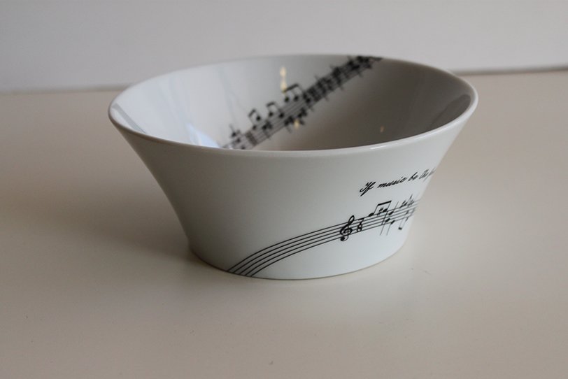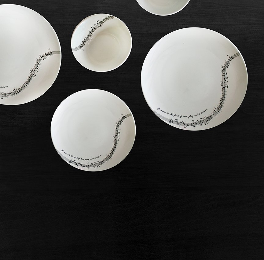 Descriptif : New ceramic collection – Tafelmusik – with a set of three pieces distinguished by modern and minimal lines, in a high quality porcelain.' ' The original musical text is inspired by the famous words of W. Shaskespeare (“If music be the food of love, play on!”)' ' Design: MUSIC GIFT' Composer: Jonas Pinho' Portuguese guitar: Eduardo Baltar' Made in Portugal by SPAL Porcelanas.' ' Since 1965, SPAL is one of the most importants manufactures procelain dinnerware for both domestic and professional purposes.' In fine porcelaine.